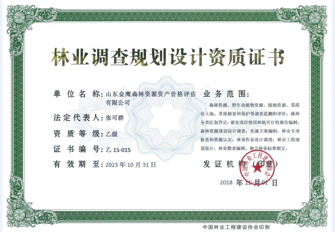 公司現擁有國內林業(yè)工程建設協(xié)會(huì )頒發(fā)的《林業(yè)調查規劃設計資質(zhì)證書(shū)》乙級資質(zhì)和山東省價(jià)格協(xié)會(huì )頒發(fā)的《價(jià)格評估機構登記資格證書(shū)》,是省內林業(yè)規劃設計和森林資源資產(chǎn)評估領(lǐng)域知名的咨詢(xún)服務(wù)機構。